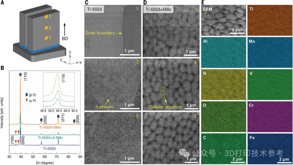 新研究帶來(lái)的重大突破研究人員此次沒有使用可能導(dǎo)致鈦合金中形成脆性金屬間共析體的β-共析穩(wěn)定劑元素,而是選擇了來(lái)自β-同晶族的Mo [包括鈮 (Nb)、鉭 (Ta) 和釩 (V)] 用于Ti-5553(Ti-5Al-5Mo-5V-3Cr)。原位合金化過程中,將鉬精確輸送到熔池中,在每層掃描期間充當(dāng)晶體形成和細(xì)化的籽晶核。Mo添加劑促進(jìn)了從大柱狀晶向細(xì)等軸和窄柱狀晶結(jié)構(gòu)的轉(zhuǎn)變。Mo還可以穩(wěn)定所需的β相并抑制熱循環(huán)過程中相異質(zhì)性的形成。