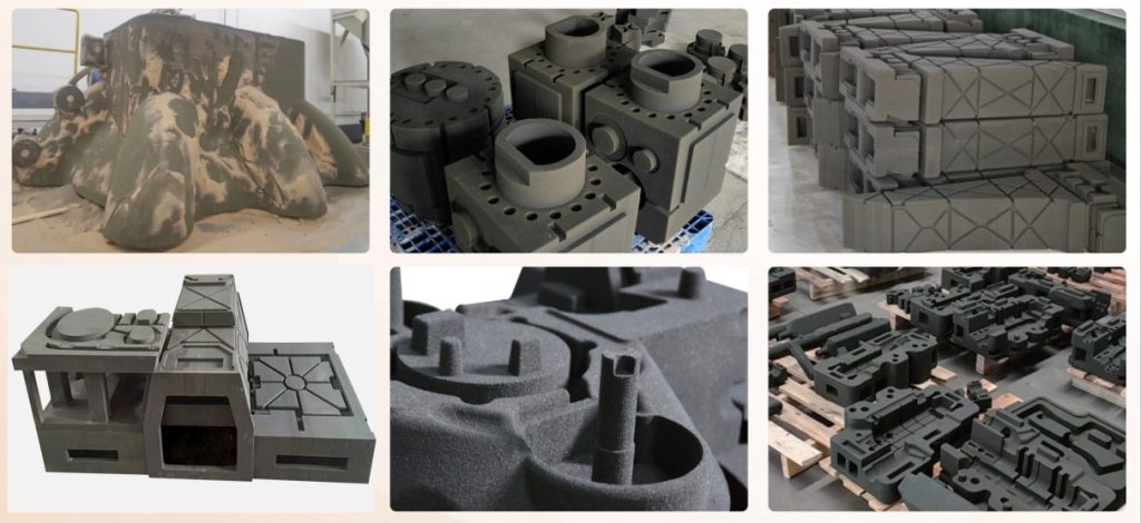 可見,大型鑄件制造在航空航天、船舶、泵閥、汽車(新能源)、能源動力(電氣)、工業(yè)機械(機器人/無人機)、軌道交通、3C電子、雕塑、教育科研、康復(fù)醫(yī)療等領(lǐng)域具有廣泛的應(yīng)用需求,而傳統(tǒng)的制造方法面臨諸多挑戰(zhàn),特別是在新產(chǎn)品的研發(fā)試制階段。例如由于鑄件尺寸巨大,通常需要拆分成部分進(jìn)行鑄造,再通過焊接集成,這不僅增加了設(shè)計負(fù)擔(dān)、時間和成本,還容易導(dǎo)致焊接缺陷,影響產(chǎn)品質(zhì)量和一致性。同時,修改模具也是個難題。