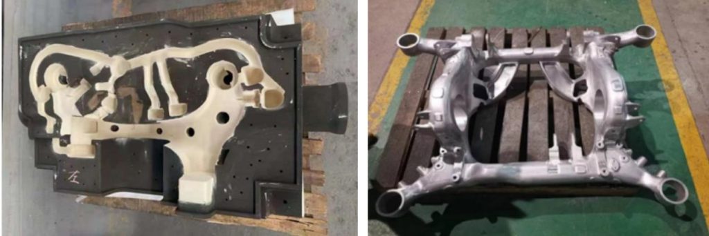 三帝科技為客戶交付的輕量化、大曲面、薄壁新能源商卡副車架,重約27KG,壁厚5.5mm,采用優(yōu)質(zhì)鋁材T6061。傳統(tǒng)鑄造方式僅模具制造就需要1-2個月,且費用高昂。采用三帝科技3D鑄造工藝2周即完成成品交付。