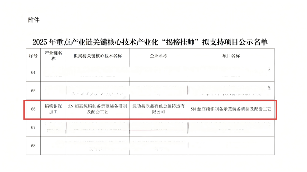 Недавно компания, которая является дочерней компанией Beijing SANDI Technology Co.Wugong Xinxin Non-Ferrous Metal Casting Co.("Xinxin Foundry") и Сианьский технологический университет ("Сианьский технологический университет") совместно объявили о проекте "Разработка демонстрационного оборудования для производства алюминия сверхвысокой чистоты 5N и вспомогательного процесса", который был успешно выбран в качестве одного из проектов, поддерживаемых "раскрытием ключевых технологий для индустриализации" ключевых промышленных цепей в провинции Шэньси в 2025 году ("Проект"). План направлен на содействие индустриализации ключевых ключевых технологий путем нацеливания и развертывания исследований и разработок ключевых ключевых технологий для коротких досок ключевых промышленных цепочек с помощью метода "раскрытия списка командиров".