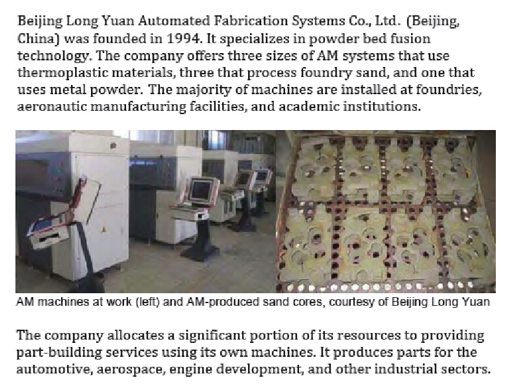 Yeni yay?nlanan Wohlers Report 2015'in Asya ?irketleri b?lümünde, endüstriyel s?n?f 3D bask? geli?tiren ve satan Beijing Longyuan Moulding de dahil olmak üzere ?in'deki bir dizi temsilci ?irketten bahsedilmektedir
