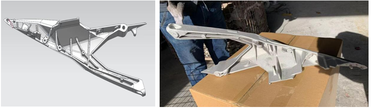 Xinxin Casting ?? s? d?ng máy in cát 3DP Longyuan ?? s?n xu?t khung xe nh? cho m?t nhà s?n xu?t ? t? n?ng l??ng m?i b?ng c?ng ngh? ?úc cát nhanh. N?u s? d?ng ph??ng pháp truy?n th?ng, chu k? s?n xu?t s? m?t 40 ngày. S? d?ng c?ng ngh? ?úc nhanh b?ng máy in 3DP Sand Mold, ?? chính xác kích th??c c?a s?n ph?m ?úc cu?i cùng ??t c?p CT7, ?? nhám b? m?t d??i Ra12.5μm, b? m?t s?n ph?m ?úc kh?ng có l? khí, v?t n?t, hình d?ng hoàn ch?nh, c?u trúc r? ràng. Cu?i cùng, s?n ph?m ?úc nh?m h?p kim (ZL101) hoàn ch?nh ???c giao trong 6 ngày, th?i gian s?n xu?t rút ng?n 85%, chi phí gi?m 32%.